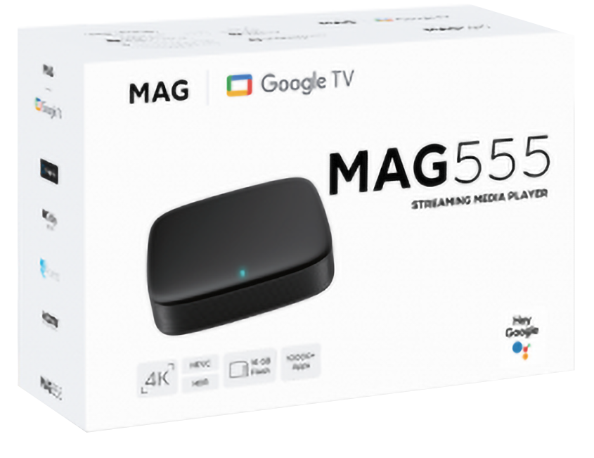 The MAG555 is a versatile device that turns any TV into an entertainment hub. With support for 4K HDR at 60 frames per second and Dolby Digital™ 8-channel sound, you’ll experience an unparalleled audiovisual journey. Designed for IPTV/OTT users, this set-top box integrates seamlessly with Google TV™, bringing all your favorite apps and services together in one place.